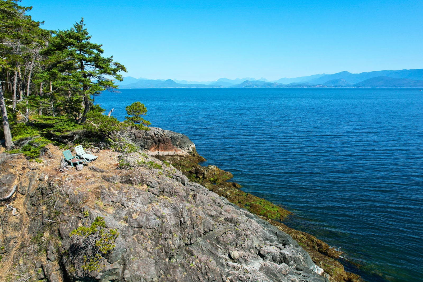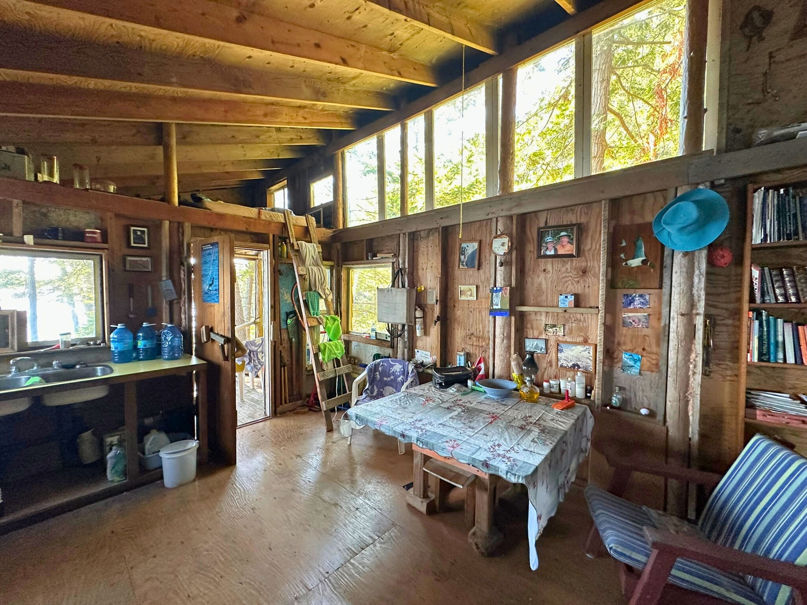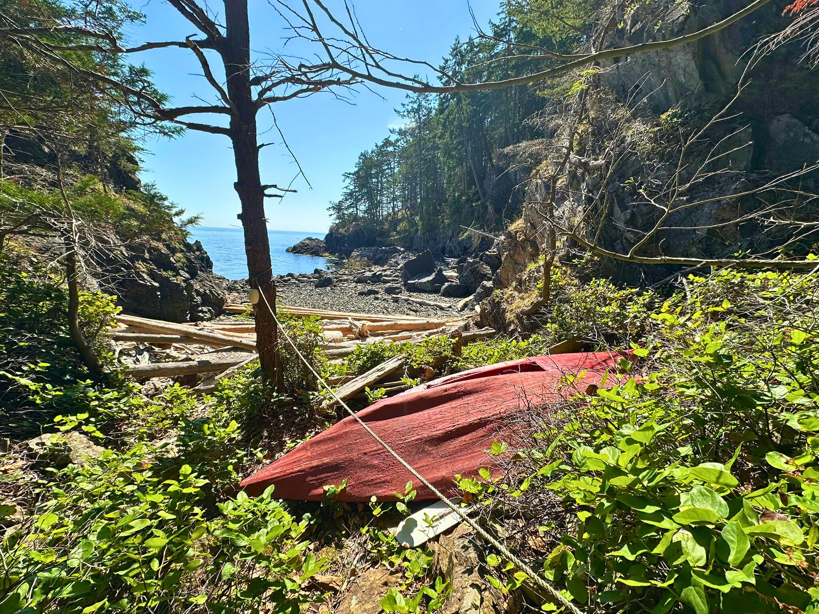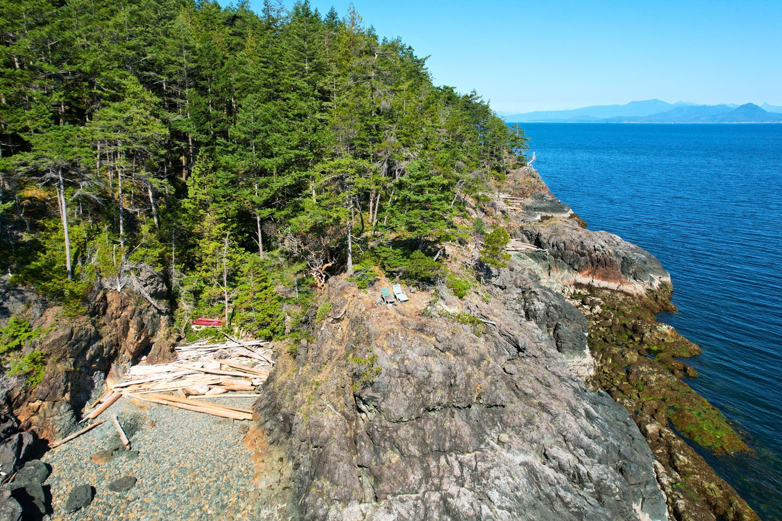 The property features two coves, including one beside the cabin with a rocky beach well-suited for launching kayaks or small boats. A network of walking trails weaves through the forested landscape, while the access road to Anderson Bay passes through the middle of the acreage. Trail access also connects directly from Anderson Bay into the property, making it an excellent base for hiking, kayaking, or mountain biking on South Texada’s extensive network of old roads.