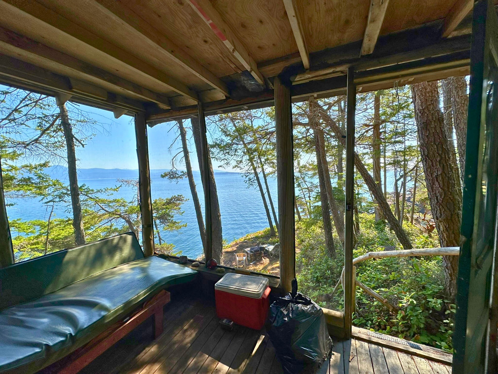 Perched on a small peninsula about 50 feet above the shoreline, a rustic 12’ x 20’ cabin provides a cozy retreat with stunning views across Malaspina and Georgia Straits. The cabin includes a loft sleeping area, wood stove, composting toilet, outhouse, and a screened front porch - an ideal spot to sit back and take in the ever-changing marine landscape. Watch humpback whales, orcas, seals, and eagles from your doorstep.