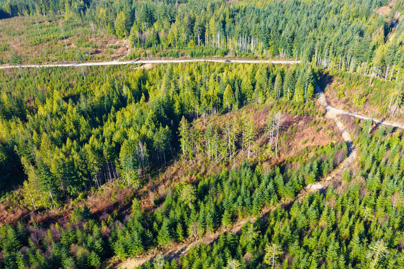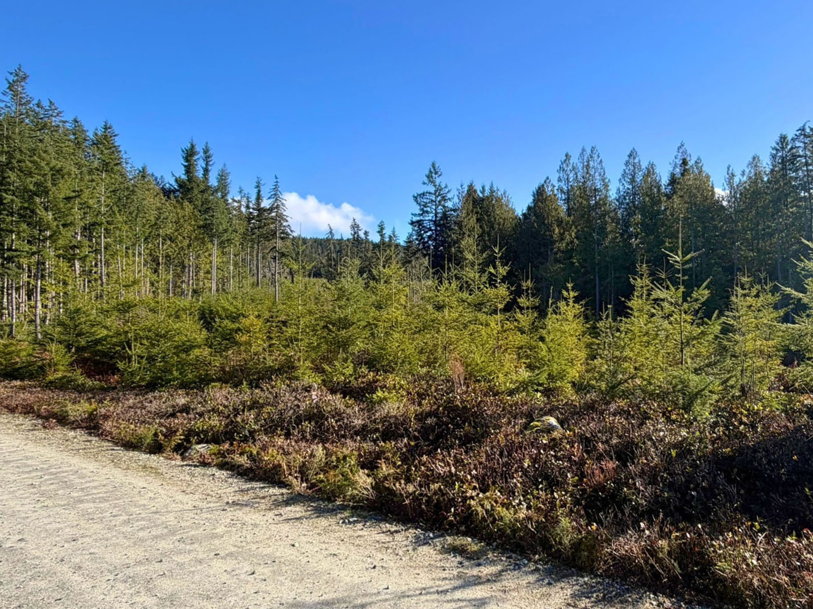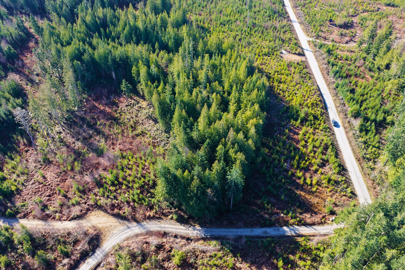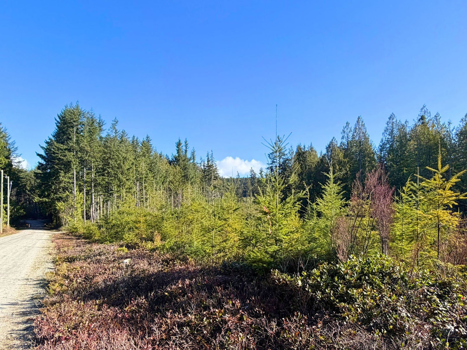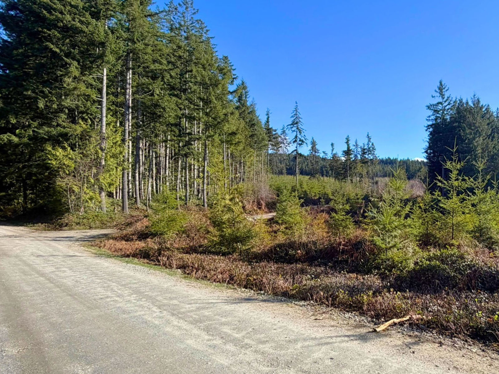 A small portion of the property features mature trees, while the majority has been replanted with younger growth in the 6- to 8-foot range, providing a mix of immediate character and long-term forest development.