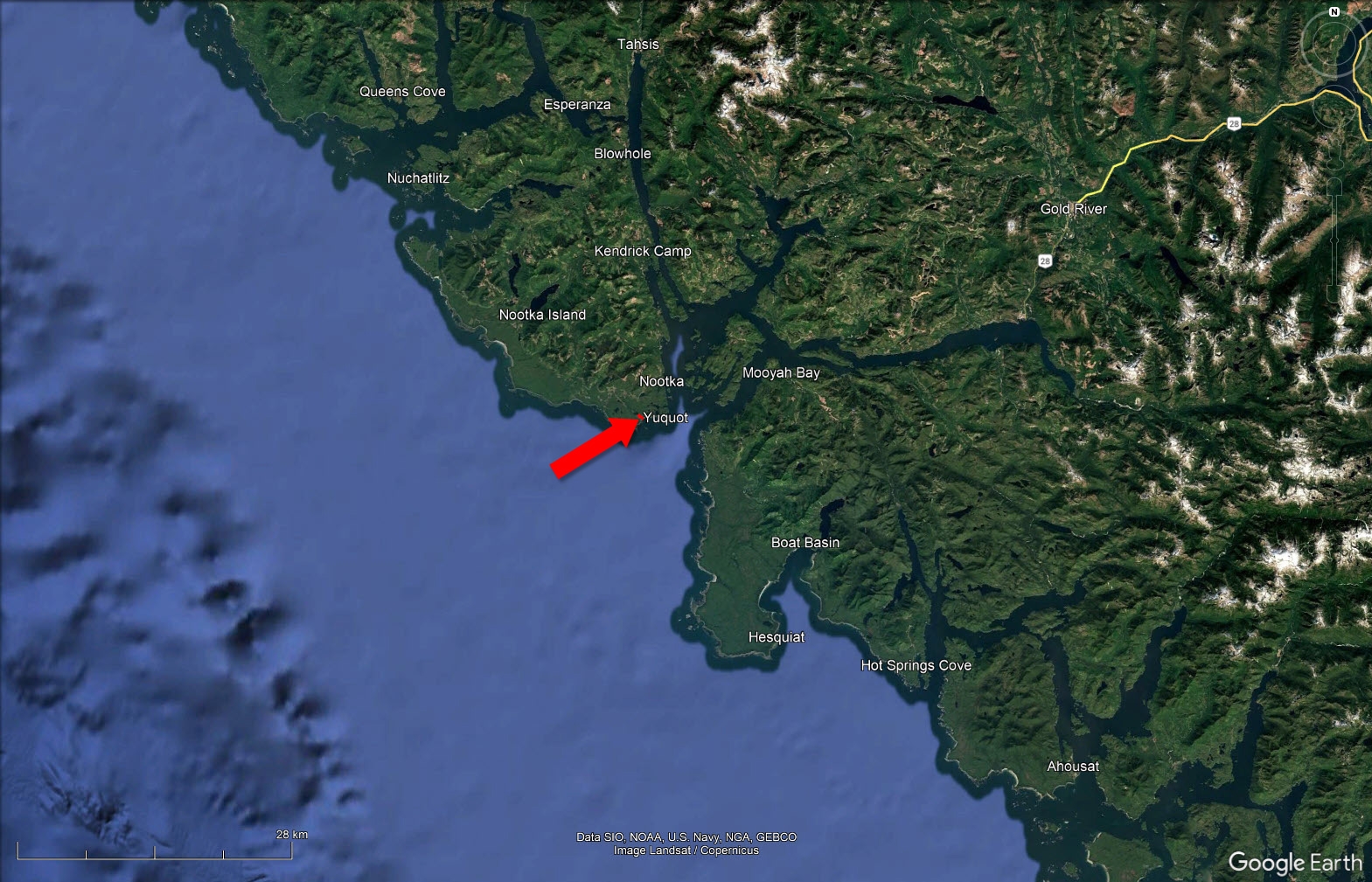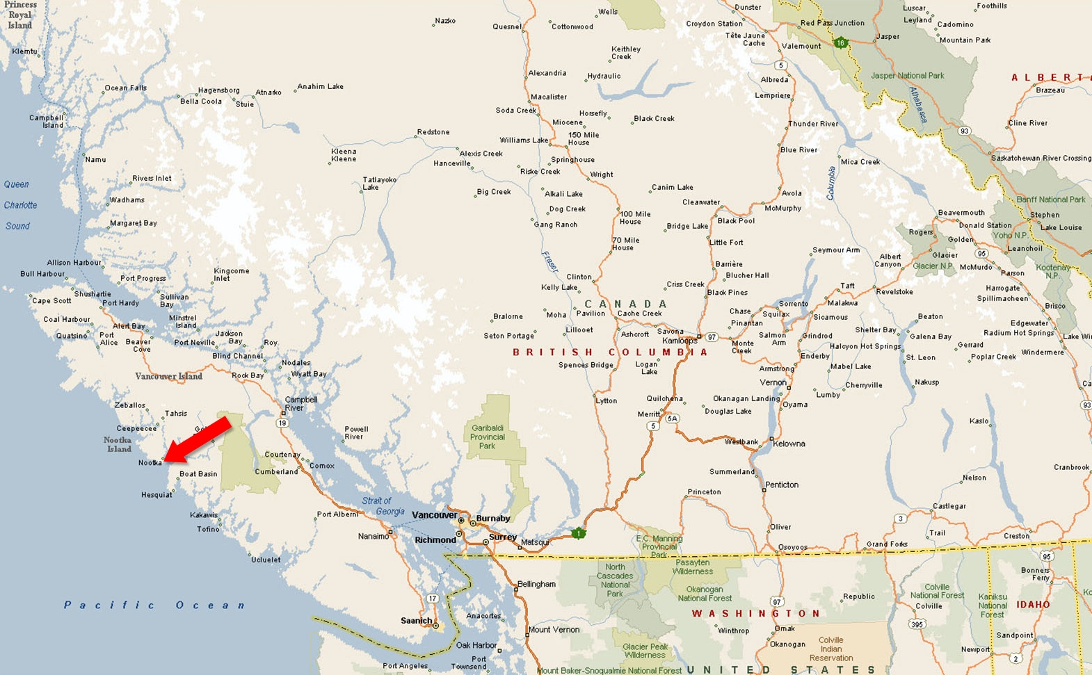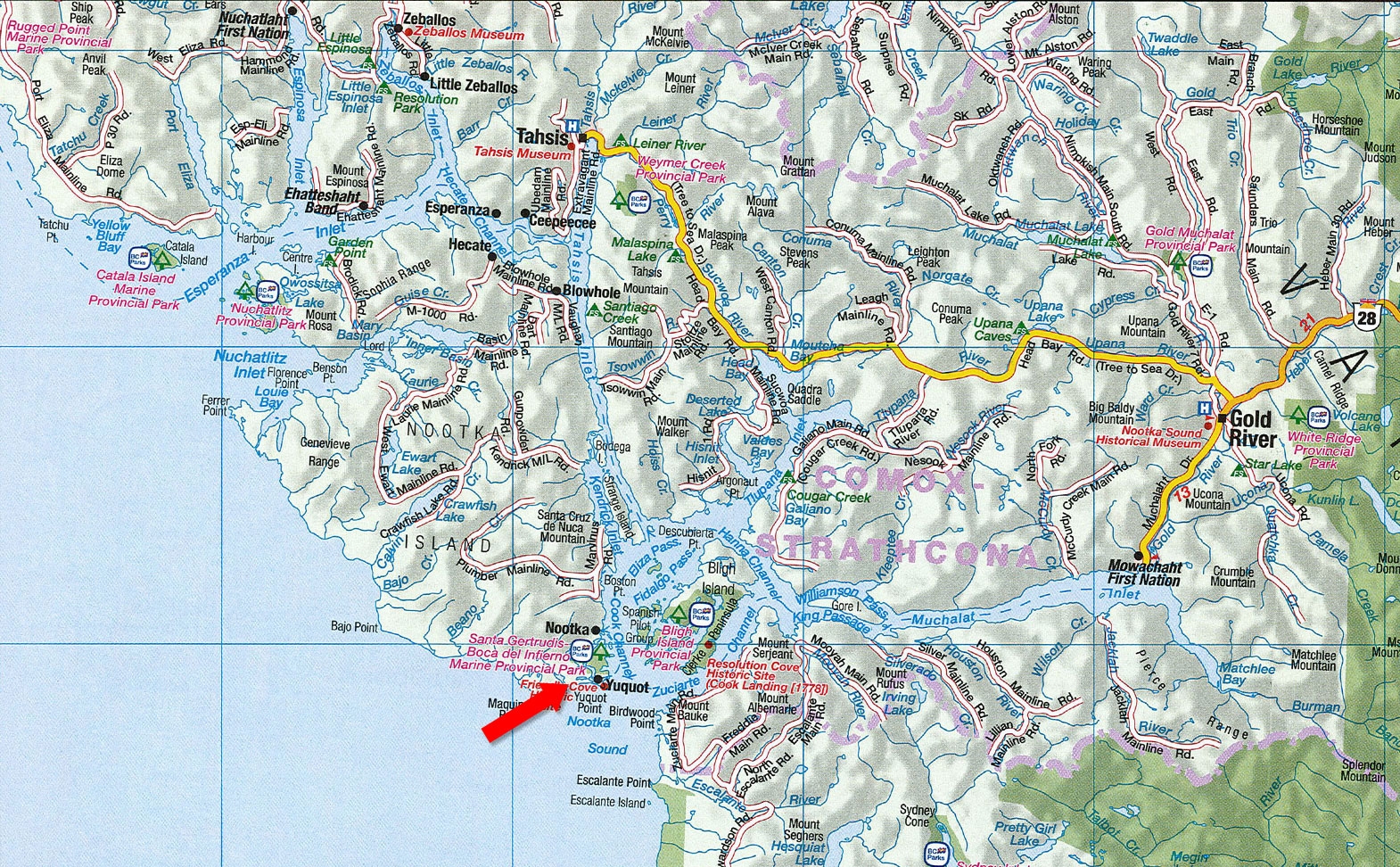 Nootka Island is a large island located on the remote and rugged west coast of Vancouver Island, enveloped by Nootka Sound, Nuchatlitz Inlet, Esperanza Inlet, Tahsis Inlet, and the Pacific Ocean.